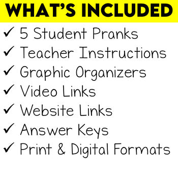 Have fun with your students with these April Fools’ Day Pranks. There are 5 different activities included: multiple choice questions, graphic organizers and a 3, 2, 1 Chart. Students will watch 4 interesting videos about high-interest topics such as flying penguins and house hippos. Then they can answer the multiple-choice questions. Students can also read several different fake websites and complete a 3, 2, 1 Chart about all the new information they learned.