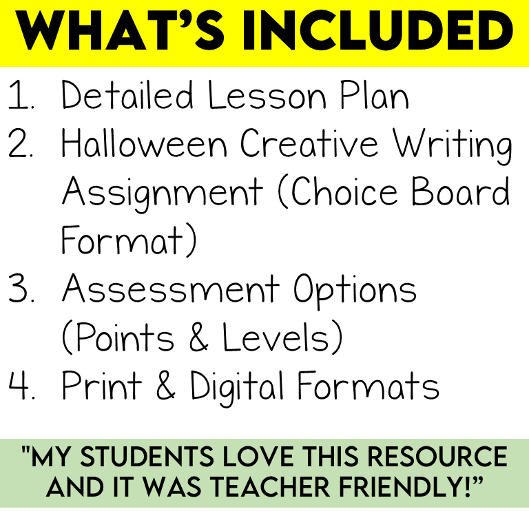 Are you ready to ignite your middle school students' creativity this Halloween season? Look no further! This specially crafted Halloween Creative Writing Assignment is designed to captivate your students' imaginations while seamlessly fitting into your curriculum.