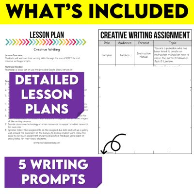 In this Halloween Creative Writing Assignment, students will step into the role of 1 of these 5 characters: a pumpkin, costume store owner, street light, black cat, and unwanted candy. These character roles come with unique writing prompts that will set their imaginations on fire. Students will create a written or visual product based on the writing prompt.